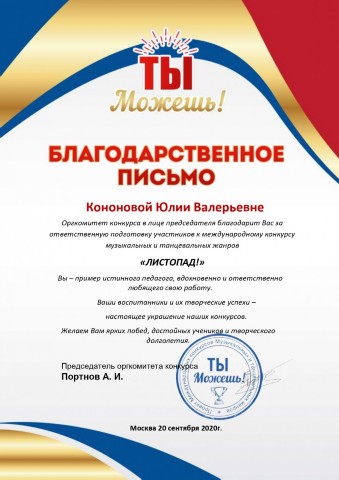 Благодарственное письмо за подготовку участников к международному конкурсу