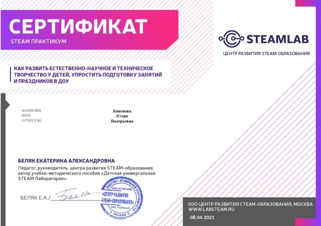 Сертификат о прохождении STEAM ПРАКТИКУМА