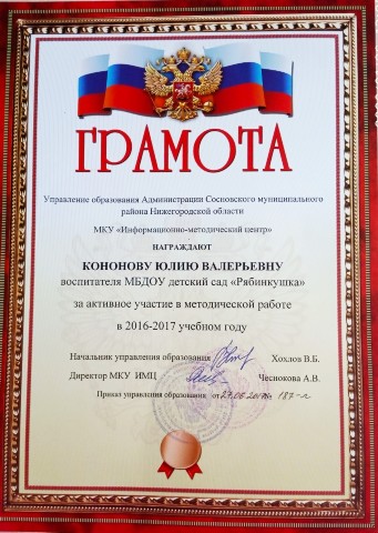 Грамота за активное участие в методической работе