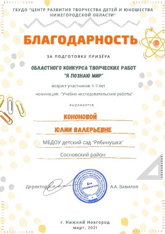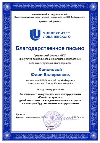 Благодарственное письмо за подготовку участника регионального конкурса детского конструирования "Юный конструктор" 2020 год |