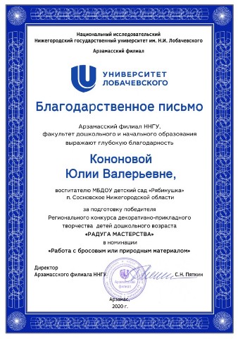 Благодарственное письмо за подготовку победителя регионального декоративно-прикладного творчества детей дошкольного возраста "Радуга мастерства" 2020 год |