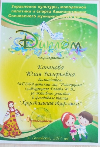 Диплом за активное участие в фестивале танца "Хрустальная туфелька" 2017 год |