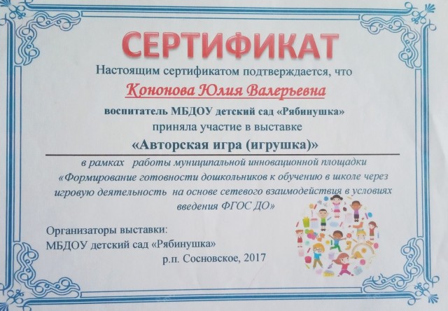 Сертификат участника выставки "Авторская игра"