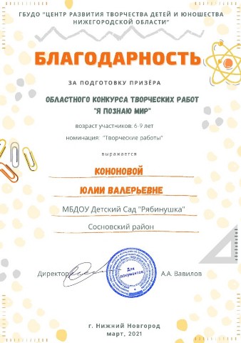 Благодарственное письмо за подготовку победителя регионального декоративно-прикладного творчества детей дошкольного возраста "Радуга мастерства" 2020 год |